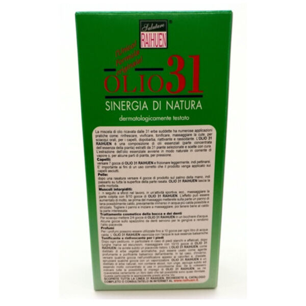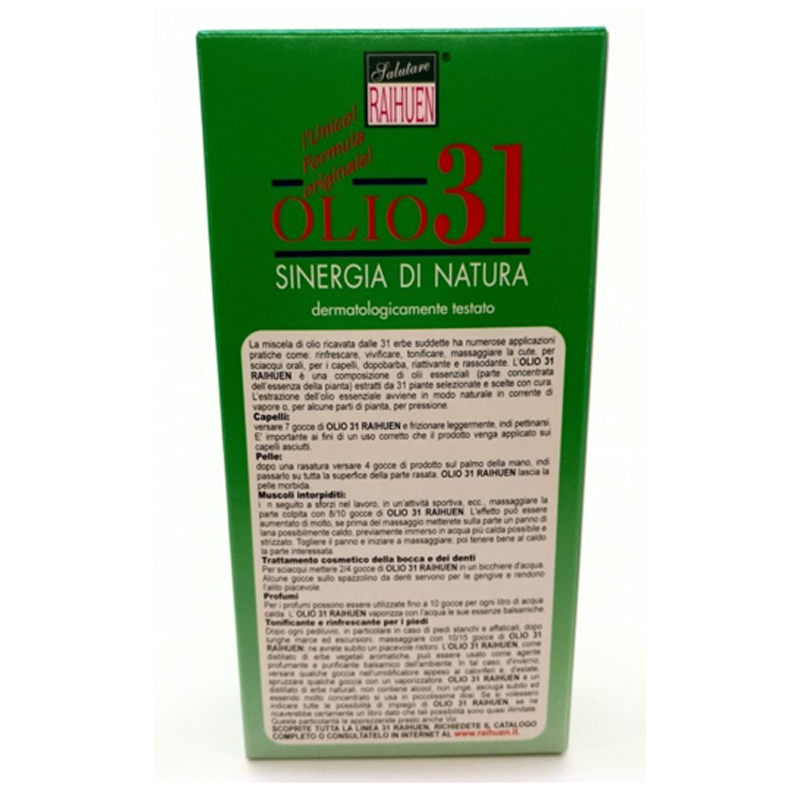 L’olio 31 miscela di 31 erbe,ha numerose applicazioni prastiche come: rinfrescare, vivificare, tonificare, massaggiare la cute, adatto a sciacqui orali per mal di denti, dopobarba, per dolori localizzati, per profumi dovuti a raffreddore, muscoli intorpiditi.