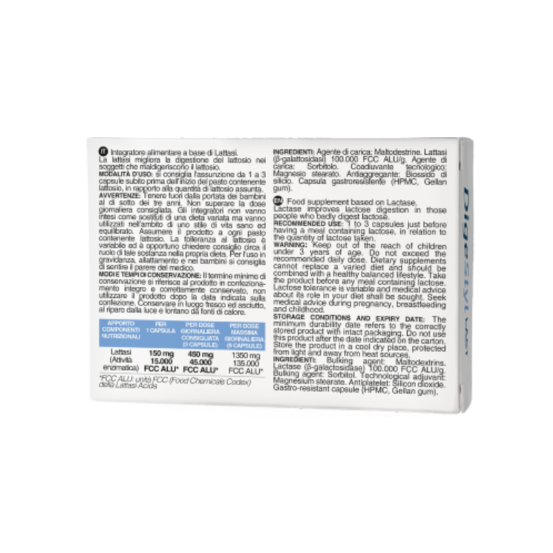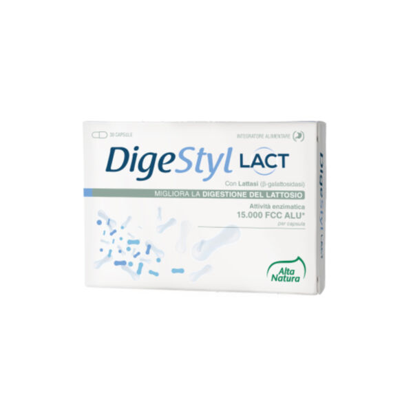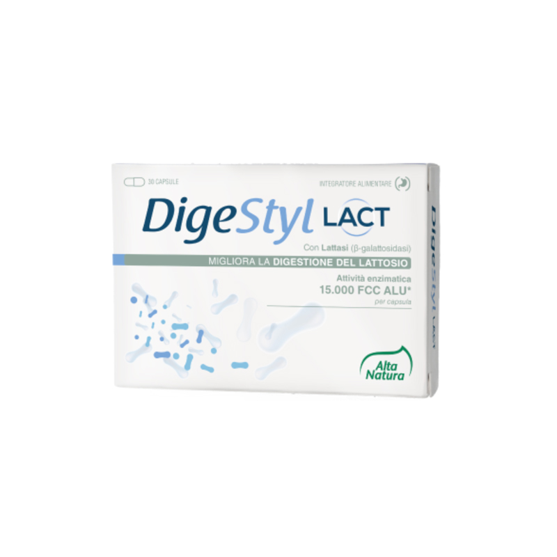 DigeStyl Lact è un integratore alimentare a base di lattasi (B-galattosidasi) in capsule gastroresistenti, progettato per migliorare la digestione del lattosio in persone intolleranti. Le capsule sono protette contro gli acidi gastrici, consentendo all’enzima di raggiungere l’intestino senza alterazioni. Ogni capsula fornisce 150 mg di lattasi, sufficiente per digerire 22,5 g di lattosio.