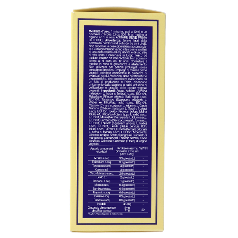 Ingredienti: Acqua, Achillea (Achillea millefolium L. herba c. floribus) e.acq. E/D:10/1, Rabarbaro (Rheum officinale Baill. radix) e.acq. E/D:10/1, Tarassaco (Taraxacum officinalis L. Weber ex F.H.Wigg. radix) e.acq. E/D:10/1, Carciofo (Cynara scolymus L. folium) e.f., Cardo Mariano (Silybum marianum L. Gaertn. fructus) e.acq. E/D:10/1, Boldo (Peumus boldus Molina folium) e.f., Bardana (Arctium lappa L. radix) e.acq. E/D:10/1, Menta (Mentha x piperita L. folium) e.acq. E/D:10/1, Sambuco (Sambucus nigra L. flos) e.acq. E/D:10/1, Equiseto (Equisetum arvense L. herba) e.acq. E/D:10/1, Betulla (Betula pendula Roth. folium) e.acq. E/D:10/1, Fumaria (Fumaria officinalis L. herba c. floribus) e.acq. E/D:10/1. Addensante: Glicerolo. Inositolo, Solfato di magnesio, Gluconato di manganese. Conservanti: Potassio sorbato, Sodio benzoato. Colorante: Caramello (E150b) di origine vegetale.