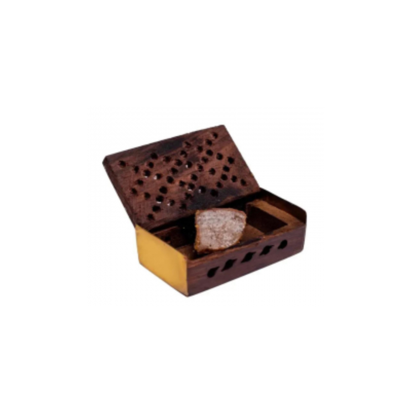 Porzione di resina d’ambra in una scatola in legno decorata.